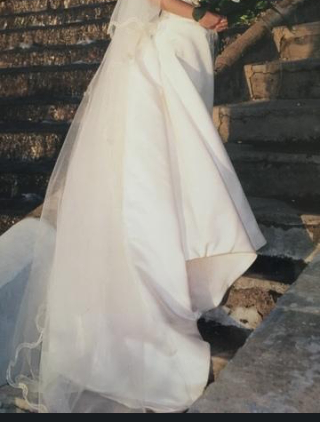 Traje de novia compuesto de corpiño, falda, cola (se puede acoplar a la falda o quitarla) y velo.