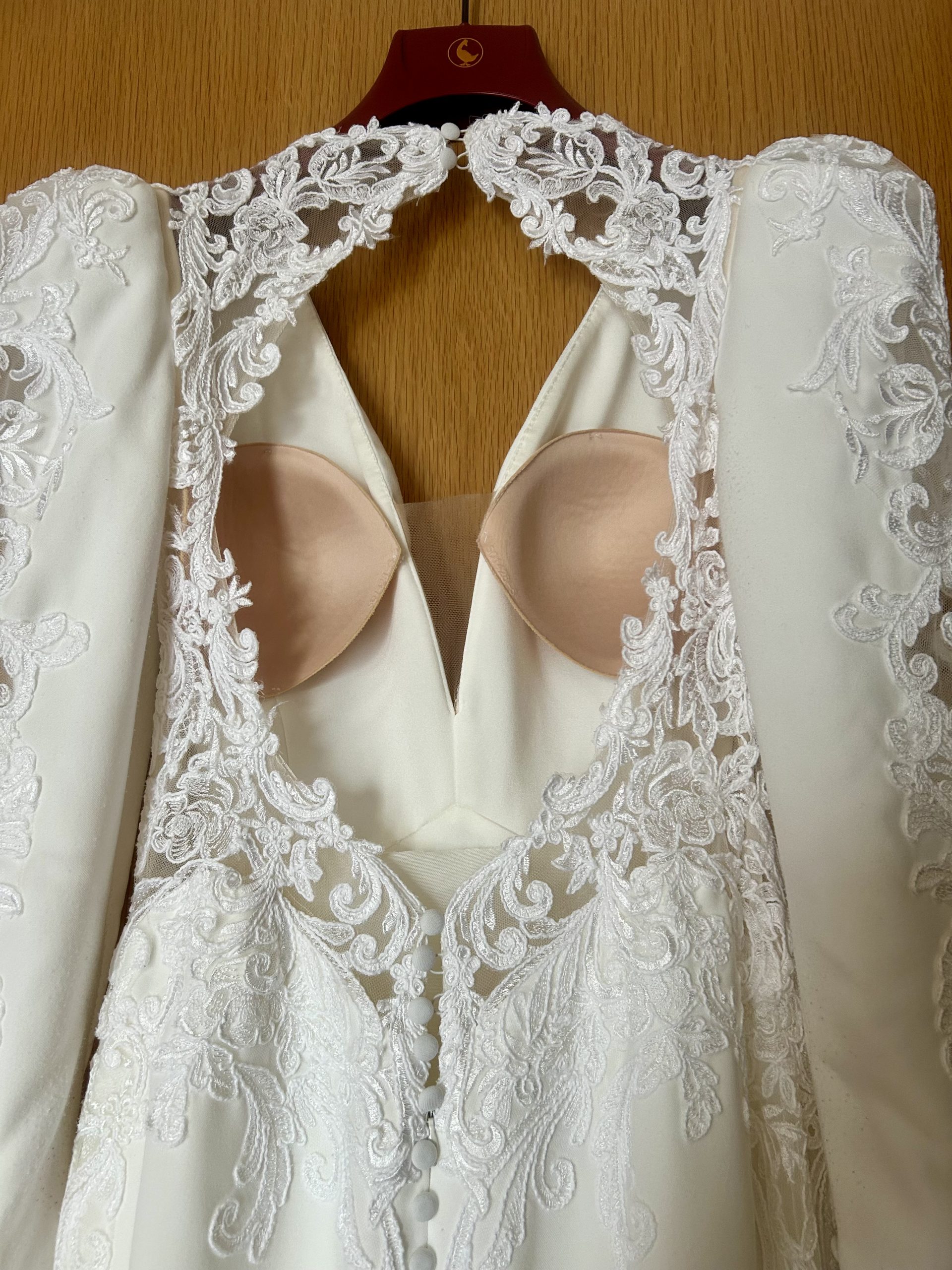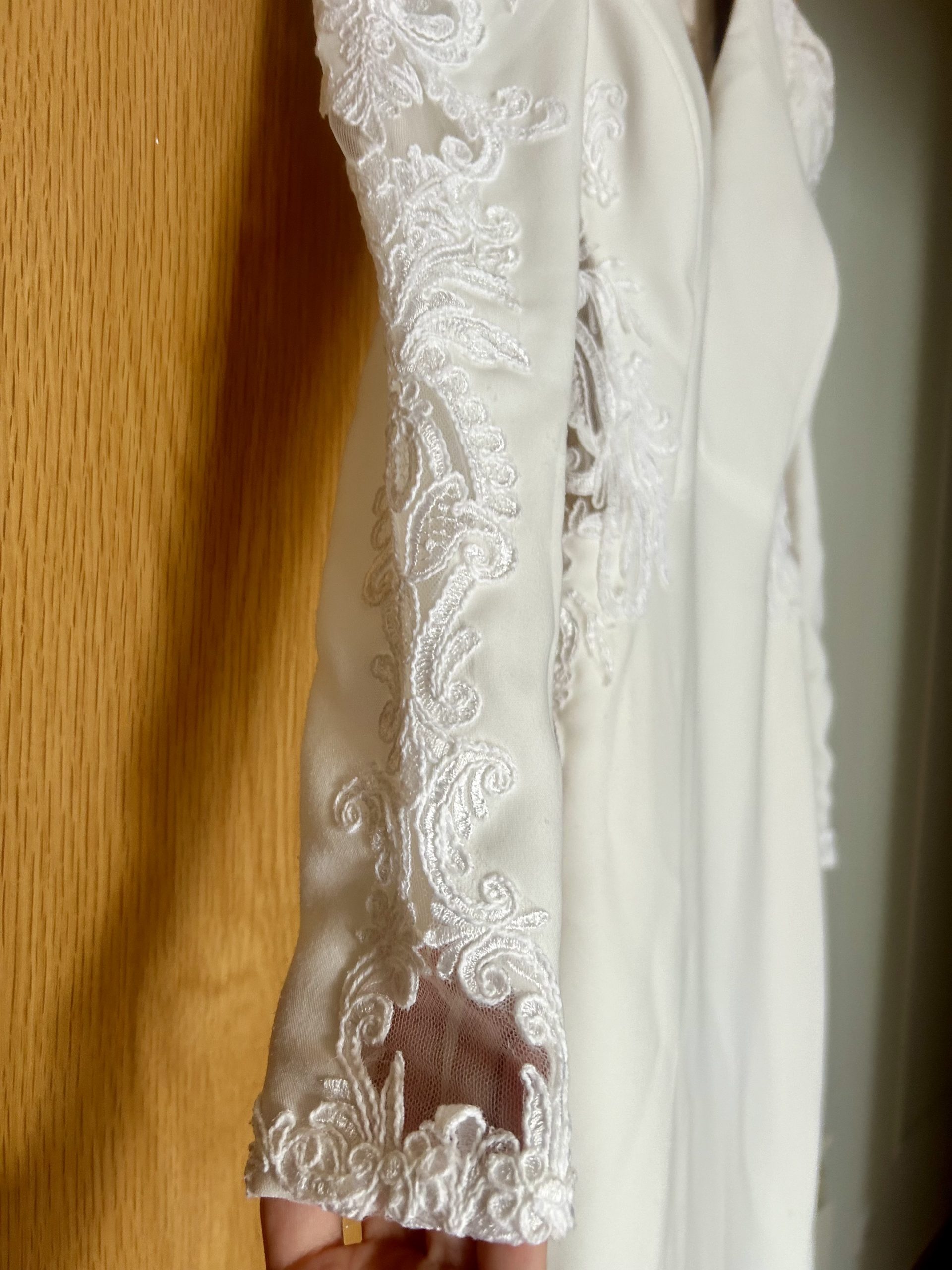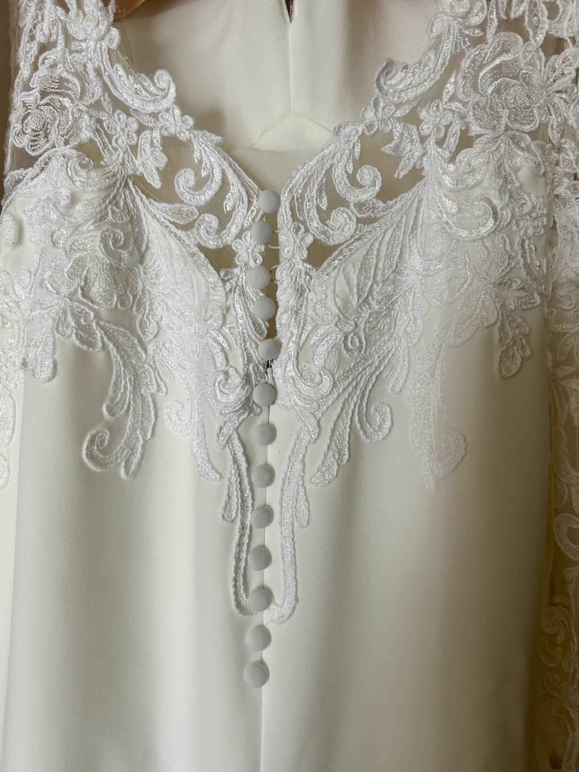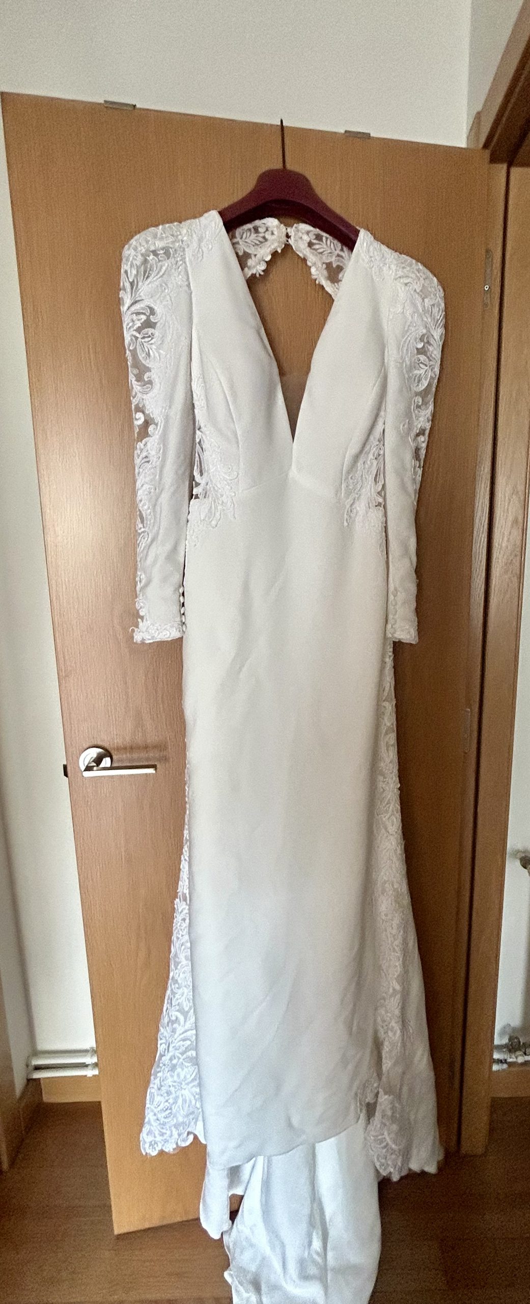 Vendo vestido de novia sirena con escote de pico en crepe. Abertura en la espalda y manga larga. En perfecto estado, cremalleras, botones y encaje sin desperfecto alguno. Vestido entallado, con hombros abullonados. Al 50% de su precio.