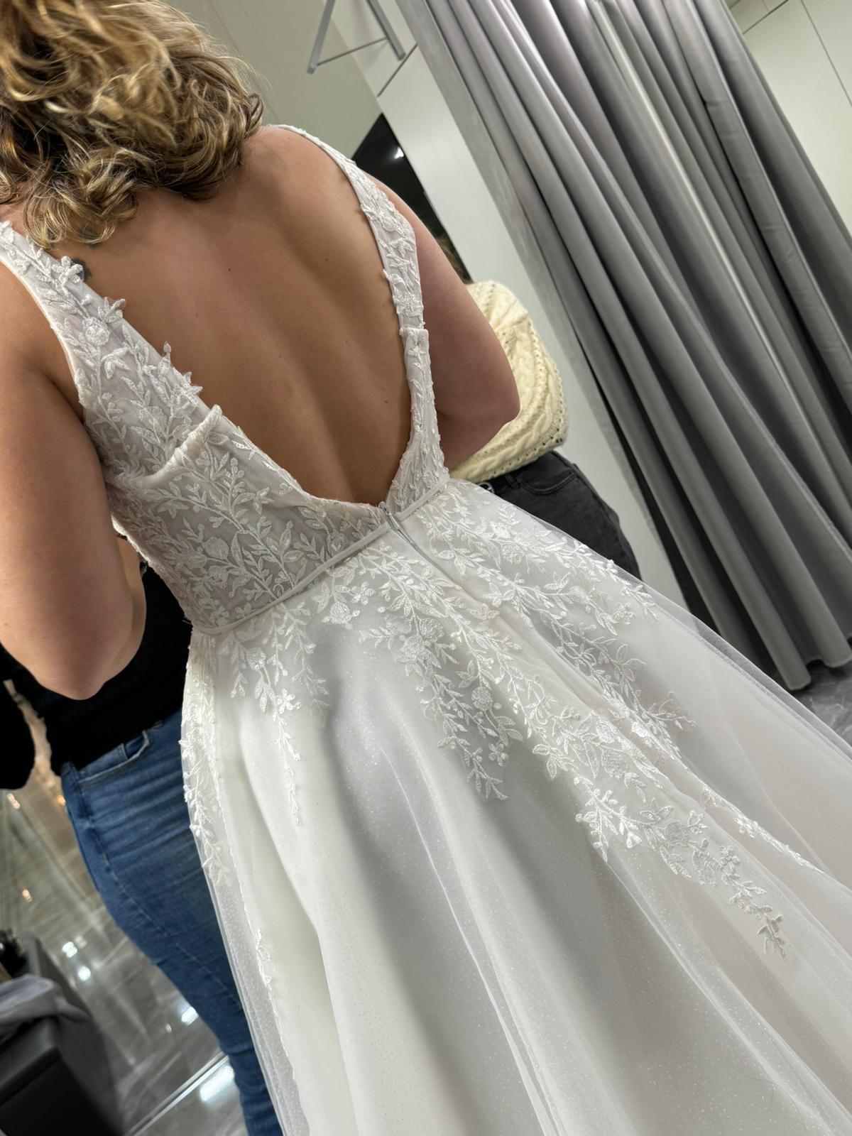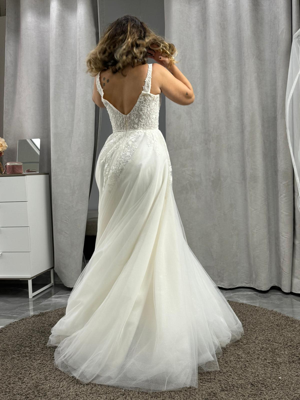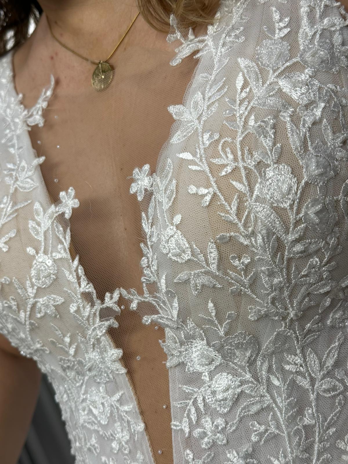 Romántico vestido de novia de corte A elaborado en tul y delicados bordados florales.