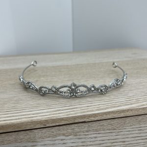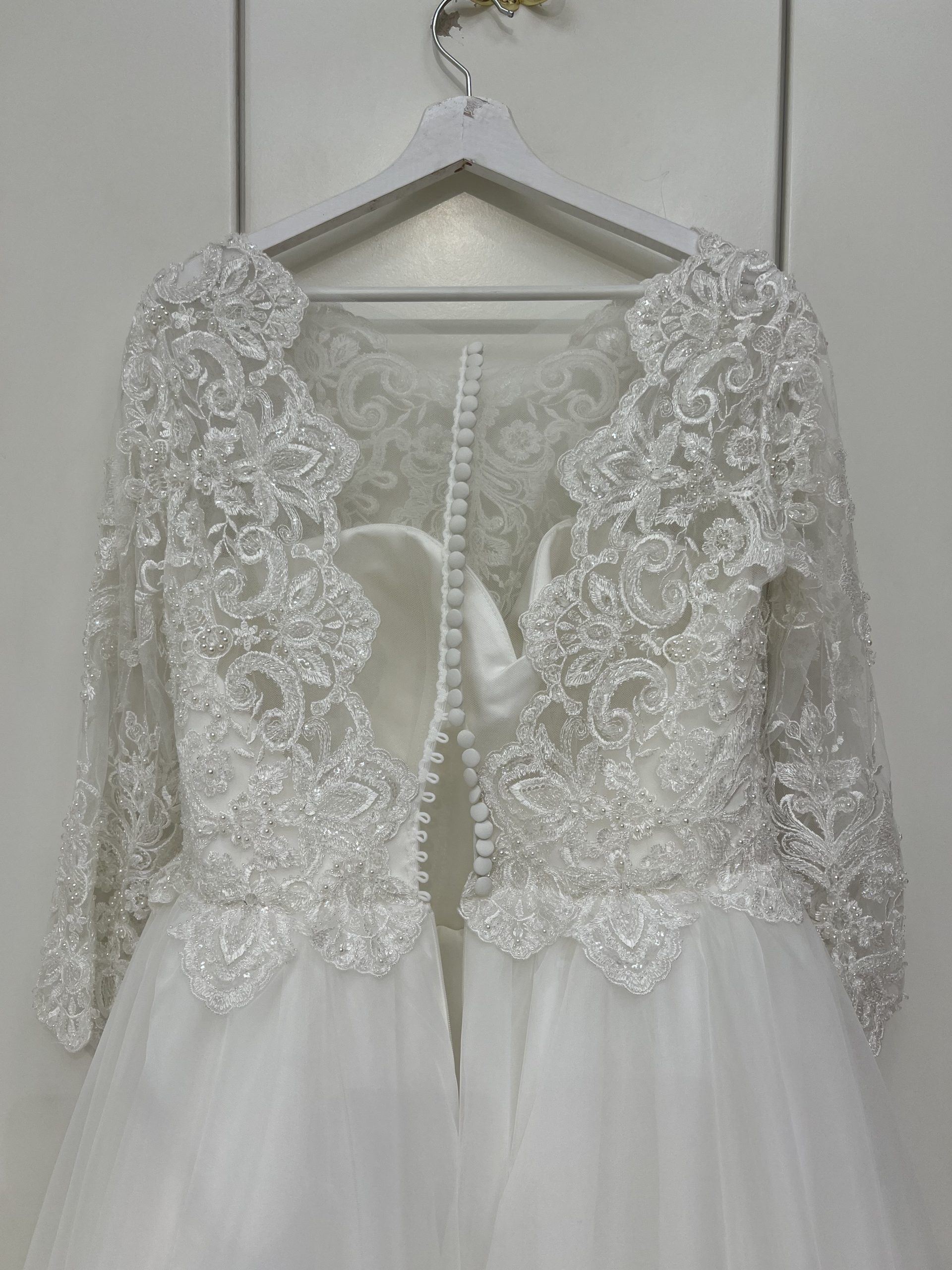Es precioso. A estrenar. Con cancán. Tiene perlitas en el encaje. En mi perfil podéis ver tanto la tiara como el velo a juego.